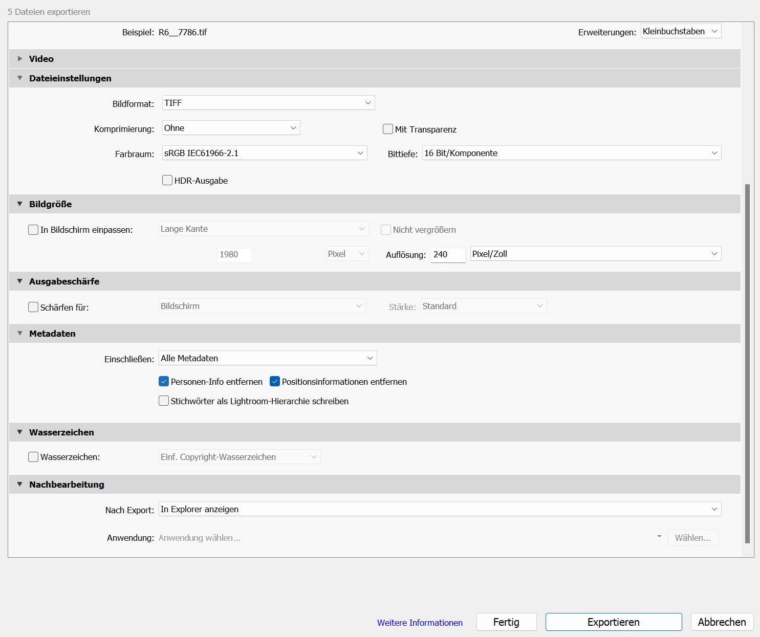 Diese Anpassungen sollten für alle deine Fotos identisch vorgenommen werden. Sobald du damit fertig bist, exportiere die Bilder im TIFF-Format (16 Bit), um die bestmögliche Bildqualität zu gewährleisten. Du kannst aber auch das etwas leichtere DNG Format nehmen und erhältst eine ähnliche Qualität.