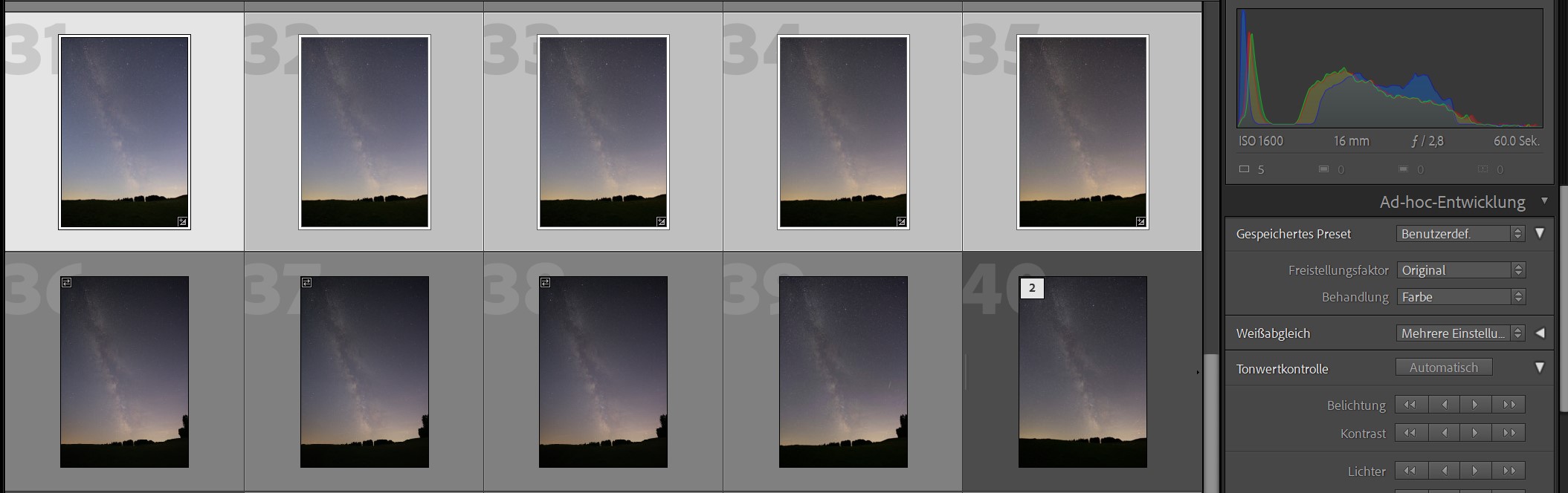 - Setze den Weißabgleich und Tonung in allen Bildern auf den gleichen Wert.